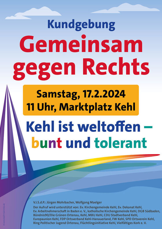 Gemeinsam gegen rechts - Kehl ist weltoffen - bunt und tolerant | Kundgebung am 17.02.2024, 11 Uhr, Marktplatz Kehl